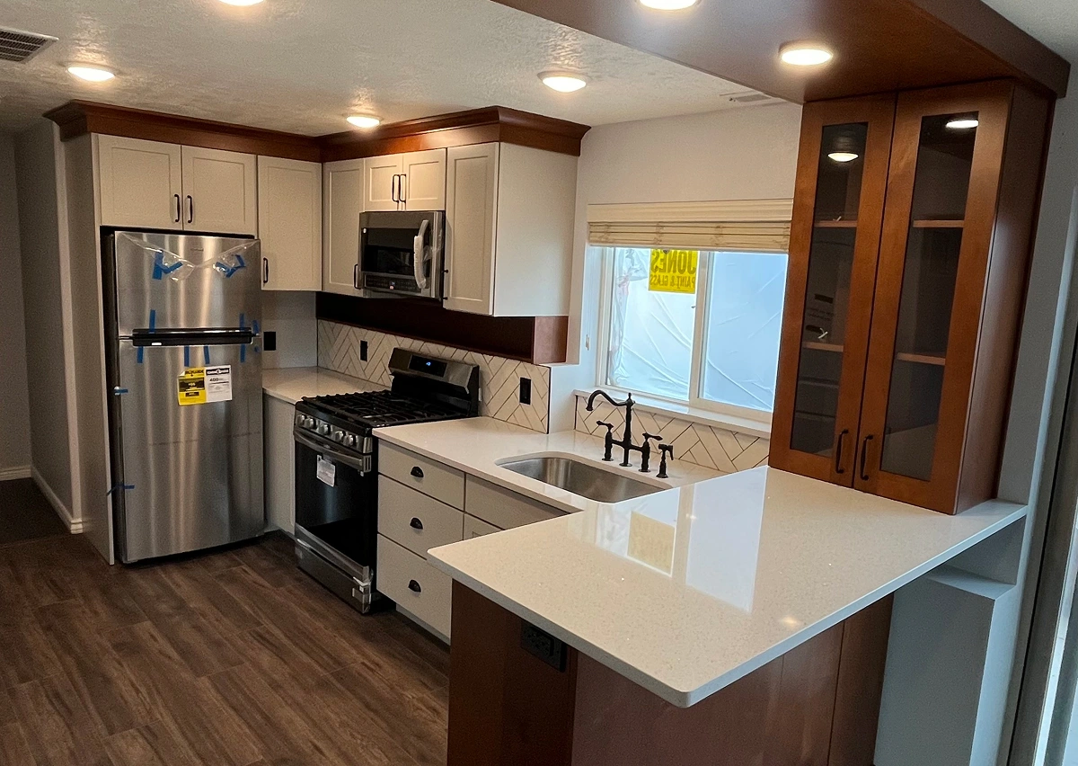 A custom kitchen remodel includes — changes to the kitchen layout, appliances, as well as changing plumbing and electrical lines as needed for the new position of items and overall layout.